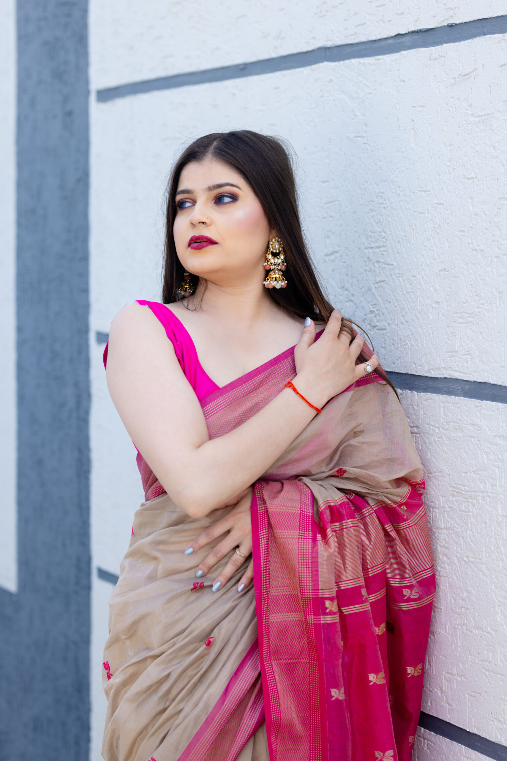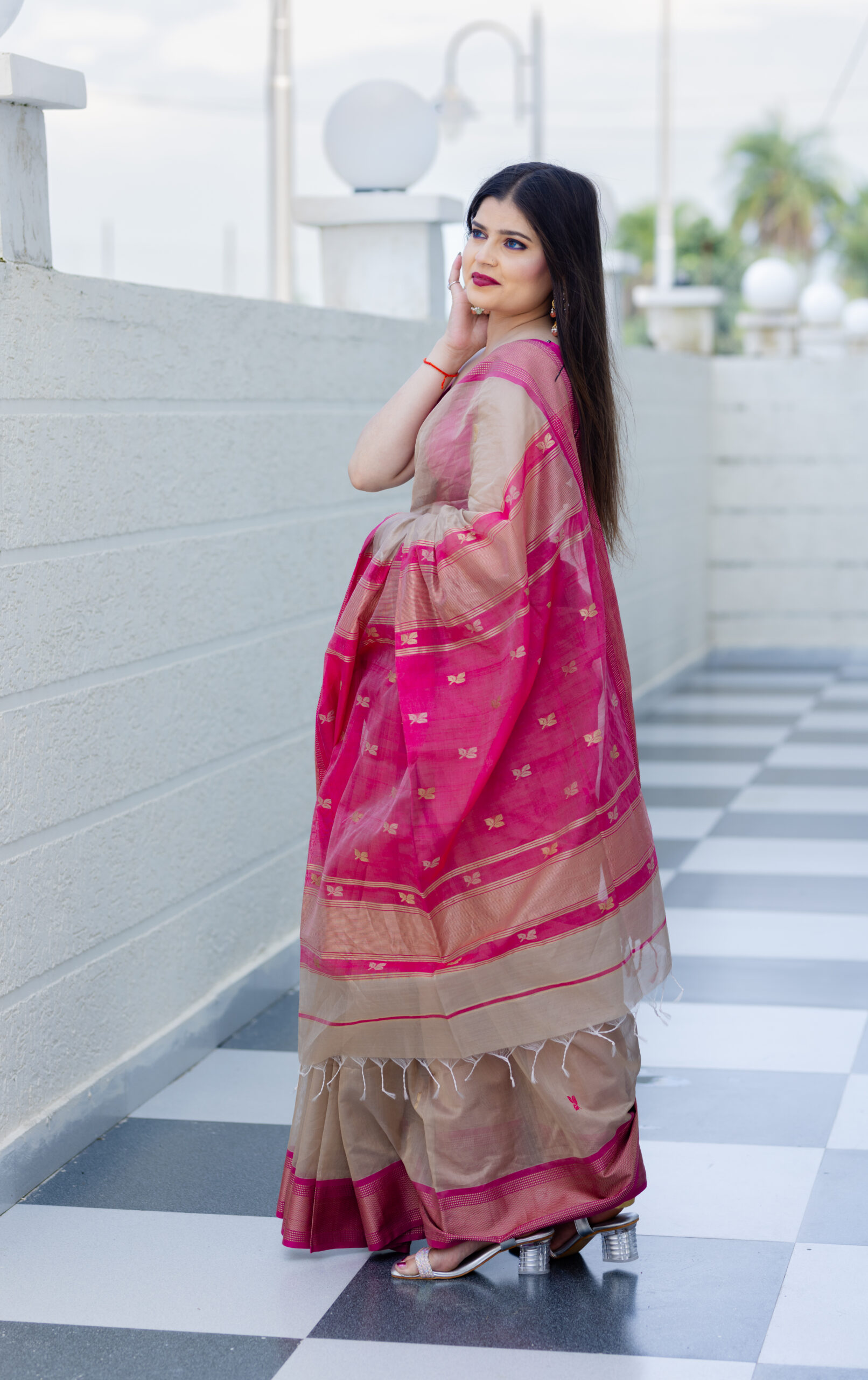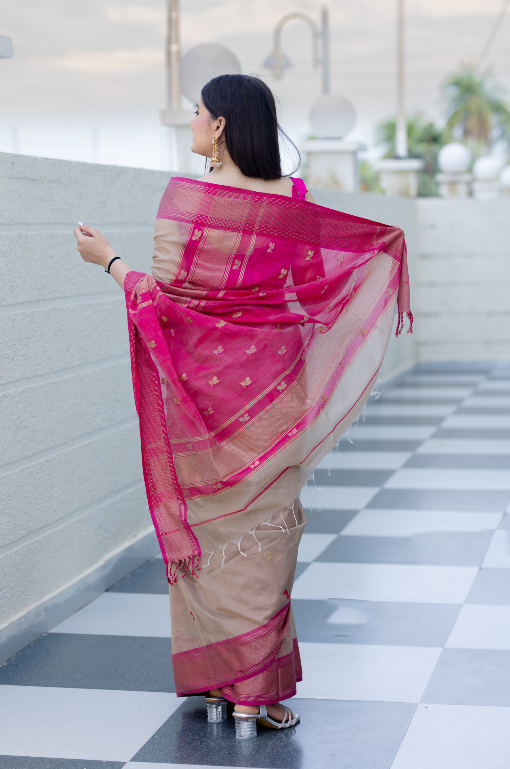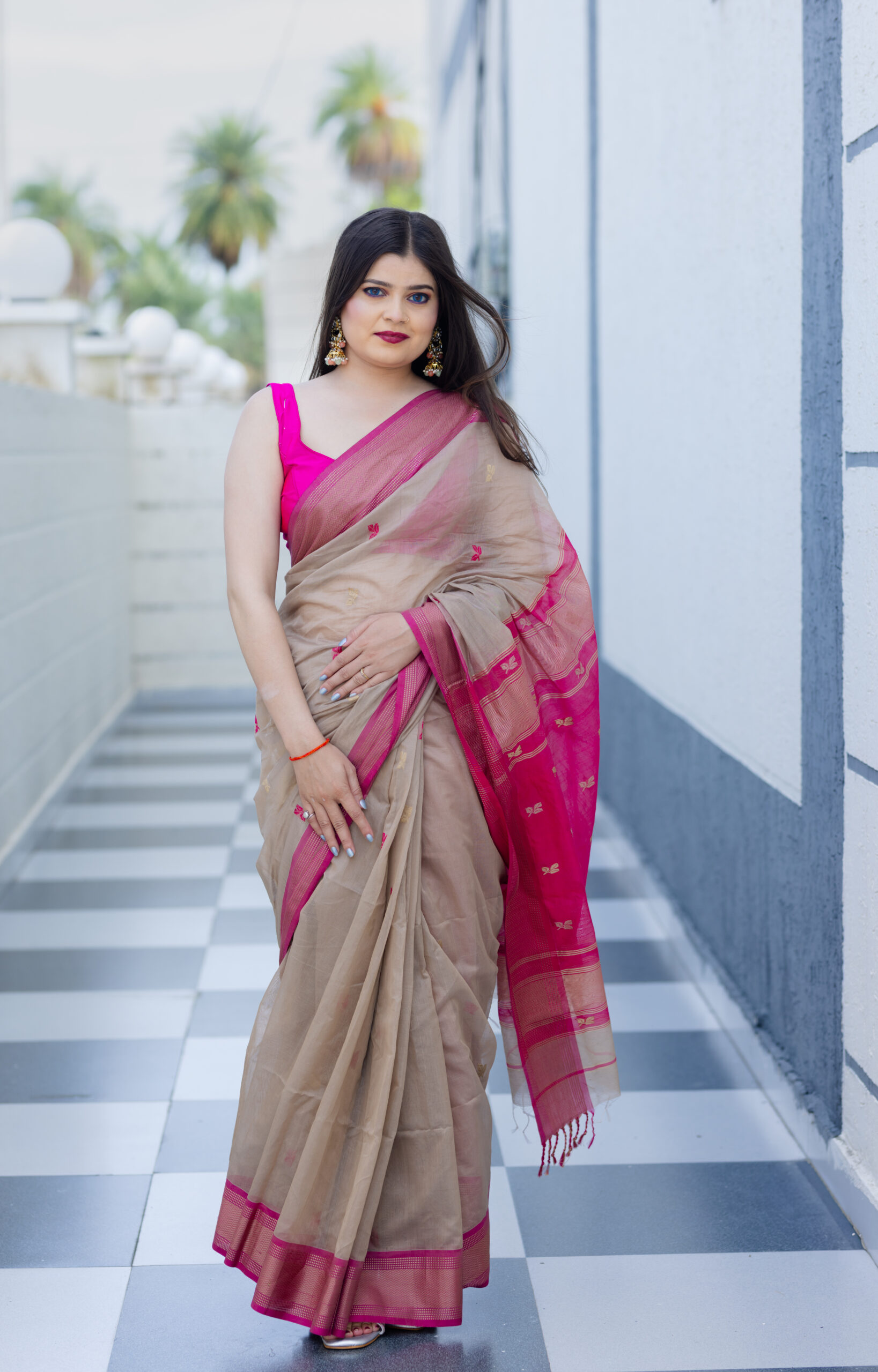 Elevate your everyday elegance with the Aarzu Maheshwari Handloom Saree – a delicate blend of tradition and modern grace.Crafted from premium Maheshwari silk-cotton, this beige saree is adorned with minimalistic zari butis and finished with a striking hot pink border and pallu. Pair it with a bold blouse, like the hot pink one styled here, for a contemporary twist.Lightweight and breathable, it drapes like a dream – making it your perfect pick for office wear, festive brunches, or intimate celebrations.