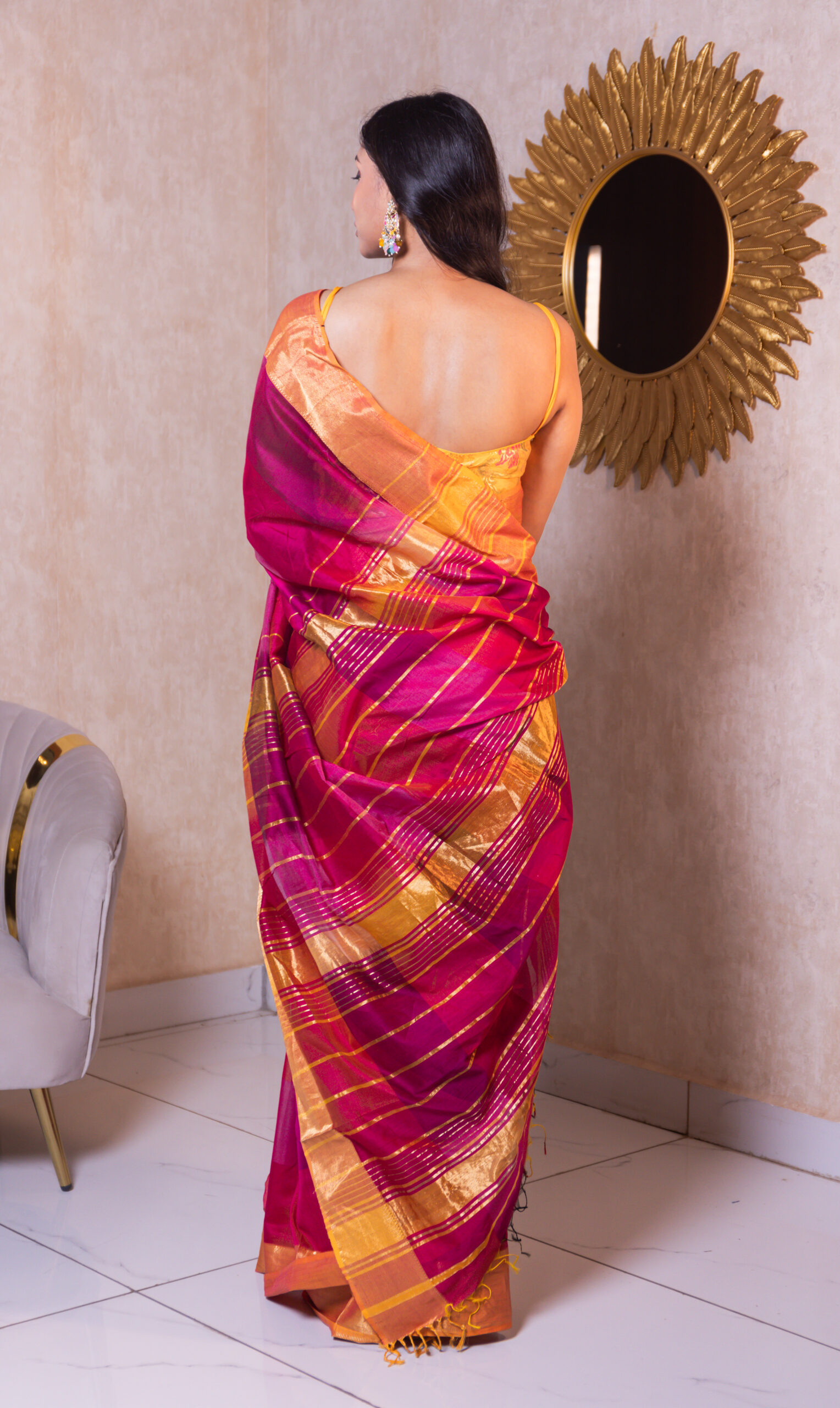Design- Subtle golden checks with contrast pallu and minimal zari detailing