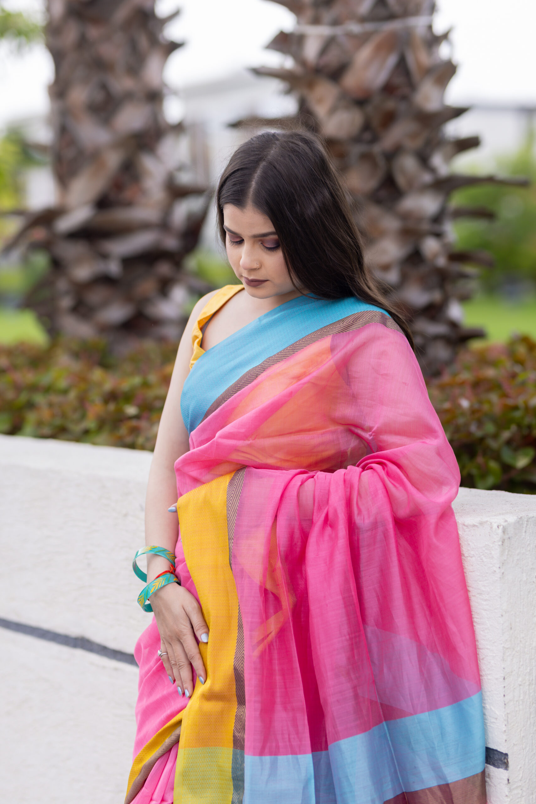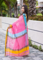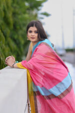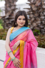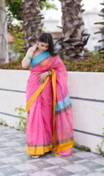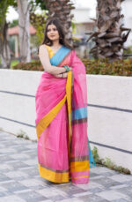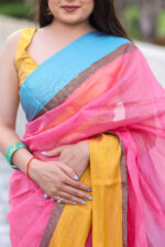 Make a bold, joyful statement with the Nyra Maheshwari Handloom Saree – a celebration of color, comfort, and craft.This eye-catching saree features a candy-pink base paired with contrasting sunshine yellow and sky blue borders, exuding playful elegance. Handwoven in fine Maheshwari silk-cotton, it’s lightweight, airy, and effortlessly stylish – perfect for festive mornings, cultural events, or brunch-ready looks.