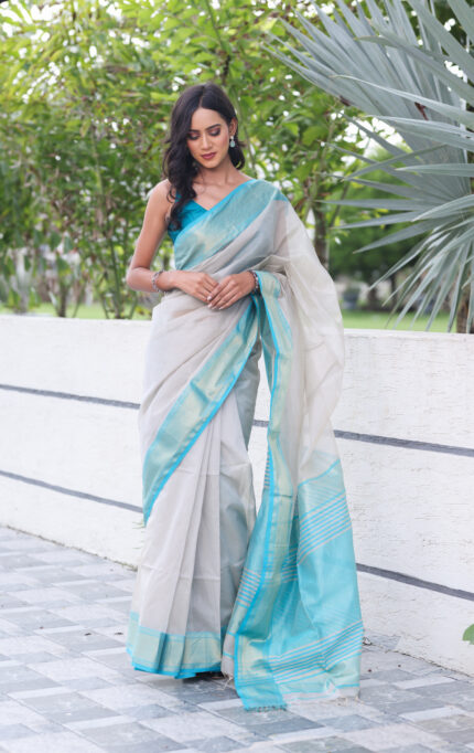Design- Color-blocked border with subtle transparency and textured pallu